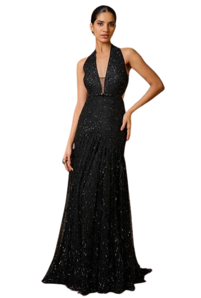The gown features a dramatic Halter Neck that gracefully ties or clasps at the nape of the neck, offering superb support and beautifully showcasing the shoulders and collarbone. The daring plunging V-neckline, subtly secured with a sheer panel, adds a touch of sultry allure without compromising comfort. The fitted bodice transitions seamlessly into a flowing, mermaid or flared skirt that sculpts your silhouette and ensures a magnificent drape. Fully lined for a smooth feel against the skin, this dress combines show-stopping style with absolute wearability. Pair it with minimalist jewelry and heels for a complete, red-carpet-ready look.