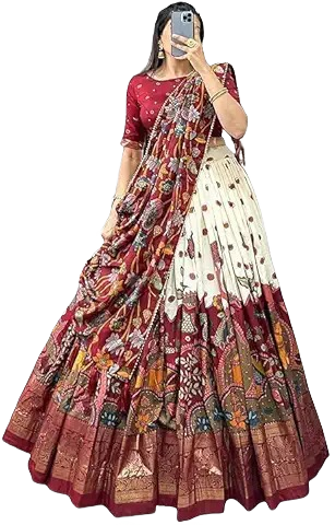 Step into elegance with this beautifully designed maroon and cream printed silk lehenga choli. Featuring intricate ethnic prints and a rich zari border, this lehenga brings a royal touch to your festive wardrobe. The maroon blouse and dupatta add a vibrant contrast, making it the perfect outfit for Navratri, weddings, receptions, and cultural occasions. Comfortable yet stylish, this ensemble is crafted to make you stand out at every celebration.